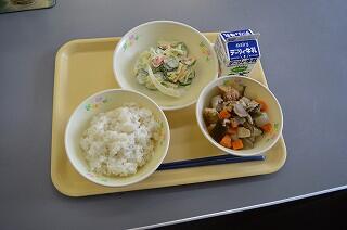 献立は、麦ご飯、牛乳、五目きんぴら、里芋の味噌汁、みかんゼリーでした。きんぴらは、ごぼうと人参、インゲンなどの野菜と豚肉、こんにゃくなどが入り、ゴマ油とゴマの風味がしてご飯のおかずにぴったりでした。味噌汁は、里芋や大根がとても柔らかく煮てあり、白味噌の味と香りが全体にしみこんでいました。ゼリーは、みかんのさわやかな香りを楽しみました。おいしくいただきました。