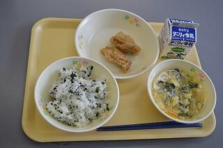 今日の献立は、わかめご飯、鶏の唐揚げレモンソース、かき玉汁、牛乳です。