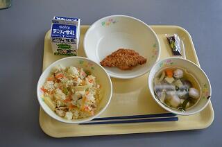 今日の献立は、チャーハン、揚げ春巻き、ワンタンスープ、牛乳です。