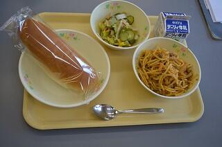 今日の献立は、ミルクパン、スパゲティミートソース、日向夏ドレッシングサラダ、牛乳です。ミルクパンはほんのり甘く柔らかかったです。スパゲティミートソースは、全体にソースがからまり、味もしっかりしていて美味しかったです。日向夏ドレッシングサラダは、さっぱりとしたドレッシングと野菜がほどよく混ざり食べやすかったです。今日も美味しくいただきました。
