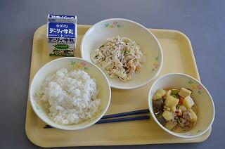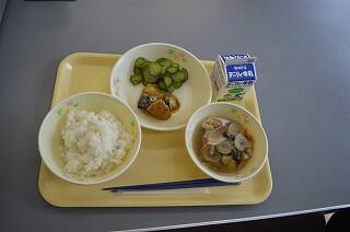 今日の献立は、麦ご飯、さばのみぞれ煮、かっぱ漬け、けんちん汁、牛乳です。
