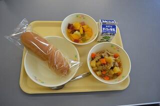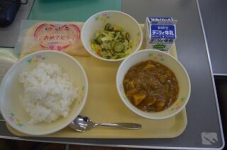 今日の献立は、ポークカレー、春キャベツのちりめん和え、お祝いクレープ、牛乳です。ポークカレーは、ジャガイモが型くずれしていなくて、豚肉も食べやすく美味しかったです。春キャベツのちりめん和えは、ごまの風味も利いていて、キャベツはもちろんですがきゅうりや人参も美味しかったです。お祝いクレープは、食後のデザートで、甘さ加減も丁度よく子どもたちも喜んでいました。今日も美味しくいただきました。