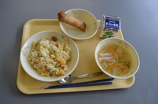今日の献立は、チャーハン、揚げ春巻き、ワンタンスープ、牛乳です。