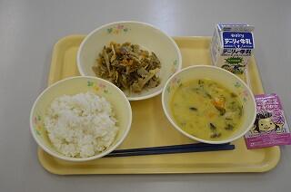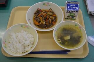今日の献立は、麦ご飯、おかかふりかけ、レンコンきんぴら、ご汁、牛乳です。