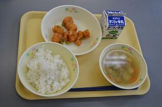 今日の献立は、麦ご飯、給食のり、筑前煮、春雨サラダ、牛乳です。給食のりをご飯にかけるとまた違った美味しさになります。筑前煮は、具材がたくさんで、彩りもよく、鶏肉のうま味と、ごぼう里芋、人参、レンコン等、味が染みこんでいて美味しかったです。春雨サラダは、はるさめにきゅうり、ハムとそれぞれ違った食感でさっぱりとして美味しかったです。今日も美味しくいただきました。