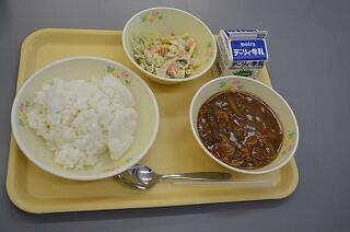 今日の献立は、ハヤシライス、マカロニサラダ、牛乳です。ハヤシライスは、グリンピースの緑や人参の赤が鮮やかで、牛肉のうま味にタマネギ、マッシュルームと美味しさが詰まっていて、食べると幸せな気分になりました。マカロニサラダは、野菜とハム、マカロニがマヨネーズであえてあり、さっぱりとした中にも、美味しさが広がります。