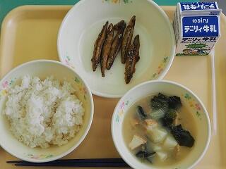 今日の献立は、千切り大根ご飯、さば生姜煮、こばっこ味噌汁、牛乳です。千切り大根ご飯は、ちりめんの香りと、千切り大根の甘さがご飯にしみていました。おかずなしでもよいくらい美味しかったです。こばっこ味噌汁は、小林の美味しい野菜がたっぷり入った味噌汁でした。さばの生姜煮は、味付けもしっかりして食べやすかったです。
