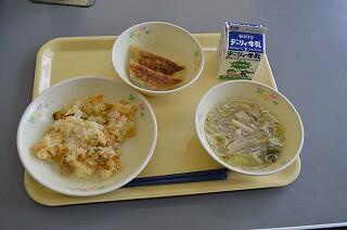 今日の献立は、キムタクご飯、焼き餃子、中華スープ、牛乳です。
