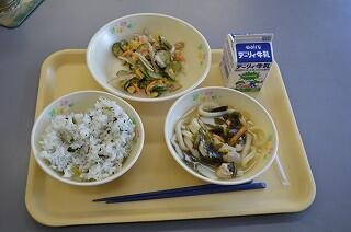 今日の献立は、大根葉ご飯、わかめうどん、ごぼうサラダ 、牛乳です。大根葉ご飯は、大根葉と味がついていて、おにぎりにすると美味しいなと思いました。わかめうどんは、具材がたっぷりで、うどんと同じくらいでした。ごぼうサラダは、ごぼうのシャキシャキ感が美味しさを増していました。今日も美味しくいただきました。