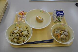 今日の献立は、高菜チャーハン、スコッチエッグ、田舎汁、十五夜大福、牛乳です。