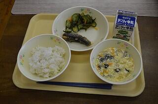 今日の献立は、麦ご飯、鰯のみぞれ煮、甘酢和え、かき玉汁、牛乳です。