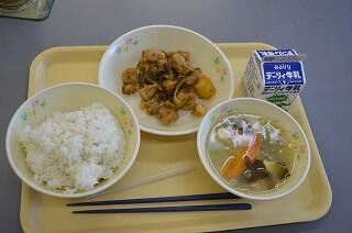 今日の献立は、麦ご飯、揚げ鶏とゴーヤの甘辛たれ、豆腐の味噌汁、牛乳です。