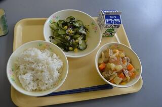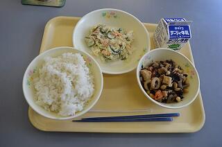 鶏肉と大豆のひじき煮は、大豆とひじきがたっぷりで、ひじきが柔らかく美味しかったです。ごまマヨネーズ和えは、きゅうりやキャベツがツナやマヨネーズと絡められていて、マヨネーズ味が美味しさを増していました。今日も美味しくいただきました。