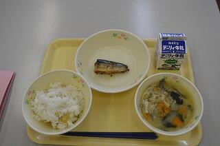 今日の献立は、須木栗の栗ご飯、秋刀魚のおかか煮、さつま汁、牛乳です。