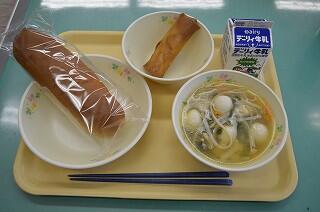 今日の献立は、黒糖パン、揚げ春巻き、鶏肉のフォー、牛乳です。黒糖パンは、甘く柔らかく美味しかったです。揚げ春巻きは、外側はパリッとしていて中はジューシーで食感もよくボリュームもありました。鶏肉のフォーは、鶏肉に小エビ、うずらの卵と具材もたっぷりでした。冷たい牛乳も美味しかったです。今日も美味しく頂きました。