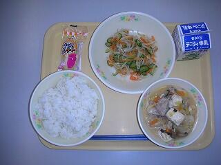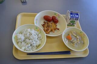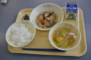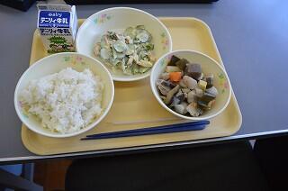 今日の献立は、麦ご飯、煮しめ、キャベツとちくわの和え物、牛乳です。煮しめは、里芋、昆布、こんにゃく、鶏肉、厚揚げ大根などの具材がたっぷりでしたが、どれも食べやすい大きさでしたので、美味しくいただくことができました。キャベツとちくわの和え物は、キャベツやきゅうりとちくわといった食感の違いもマヨネーズで美味しく和えてありました。今日も美味しくいただきました。