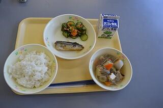今日の献立は、麦ご飯、秋刀魚の生姜煮、甘酢和え、けんちん汁、牛乳です。秋刀魚の生姜煮は、秋刀魚が柔らかく味もよく美味しかったです。甘酢和えは、お魚と合います。