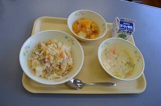 今日の献立は、キムタクご飯、卵スープ、フルーツポンチ、牛乳です。キムタクご飯は、子どもたちにも人気があります。今日もリクエスト献立になっています。味付けはあっさりしていますが美味しかったです。卵スープは、卵がふわふわして柔らかでした。