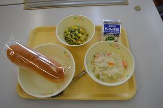 今日の献立は、ミルクパン、秋の味シチュー、コールスローサラダ、牛乳です。ミルクパンはやわらかくて、さらに甘くて美味しかったです。秋の味シチューはサツマイモにしめじ、鶏肉も柔らかく、やさしい味でした。コールスローサラダは、シャキシャキ感もあり美味しかったです。今日も美味しくいただきました。