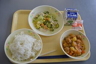 今日の献立は、麦ごはん、肉団子のケチャップ煮、チーズサラダ、牛乳、ミルメークです。肉団子のケチャップ煮は、肉団子、タマネギ、人参、筍、ピーマン、具材たっぷりで美味しかったです。チーズサラダは、野菜にチーズが入ることで、美味しさも増しました。ミルメークを牛乳に入れると,甘くなりいつもと違った味を楽しめました。今日も美味しくいただきました。