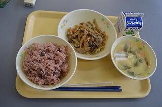 今日の献立は、赤飯、五目きんぴら、ご汁、牛乳です。赤飯は、少し塩味でおいしかったです。五目きんぴらは、ごぼうにこんにゃく、しいたけ、あげと具材もたっぷりで味もしっかりついていて美味しかったです。ご汁は、大豆の香りがしました。今日は、和食の日ということで、和を感じるメニューでした。