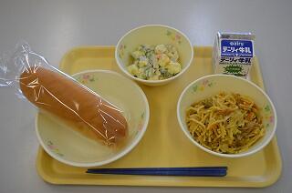 今日の献立は、コッペパン、焼きそば、サツマイモサラダ、牛乳です。焼きそばは、見た目も味や食感も焼きそばと言うよりスパゲッティのような感じでした。サツマイモサラダは、サツマイモの甘味と、マヨネーズの味がしっかりしていて、特に美味しく感じました。今日も美味しくいただきました。