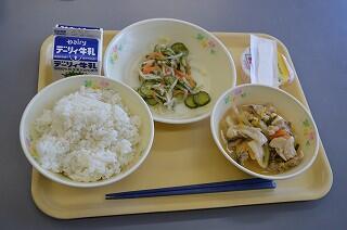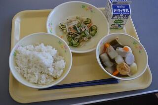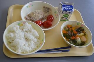 今日の献立は、麦ご飯、豚肉のゆずみそ焼き、アイコトマト、つみれ汁、牛乳です。豚のゆずみそ焼きは、須木のゆずと野尻の麦味噌を使ってあり、ゆずの香りがほのかにして、肉も軟らかく美味しかったです。低学年の児童にも食べやすかったです。つみれ汁は、つみれがふわふわして柔らかく、彩りもよかったので美味しさが増しました。今日も美味しくいただきました。
