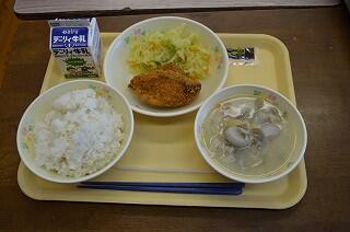 今日の献立は、麦ご飯、シイラのフライ、ソース、添え野菜、豚汁、牛乳です。