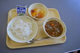 今日の献立は、チキンカレー、フルーツポンチ、牛乳です。チキンカレーは、鶏肉も柔らかく、ジャガイモや青まめ、人参、タマネギがとろとろのルーと一緒になって美味しかったです。フルーツポンチは、ゼリーにくだものたっぷりで、さわやかな美味しさでした。いろどりもよかったです。今日も美味しくいただきました。