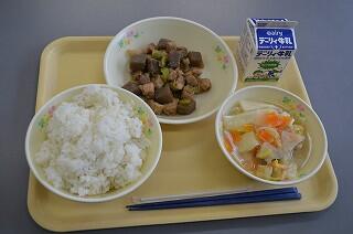 今日の献立は、麦ご飯、豚肉の甘辛煮、ほうとう汁、牛乳です。豚肉の甘辛煮は、豚肉が食べやすい大きさでしたが、かみ応えがあり、噛むたびに甘辛い美味しさを味わえました。ほうとう汁はほうとうがのっぺりしていてやさしい味でした。鶏肉や揚げも小さく食べやすかったです。今日も美味しくいただきました。