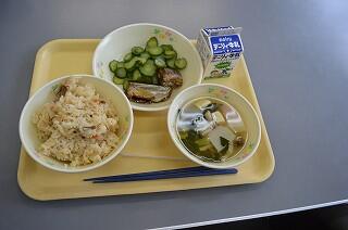 今日の献立は、五目炊き込みご飯、秋刀魚かぼすレモン煮、かっぱ漬け、すまし汁、牛乳です。五目炊き込みご飯は鶏肉にごぼう筍など味が染みこんでいて美味しかったです。