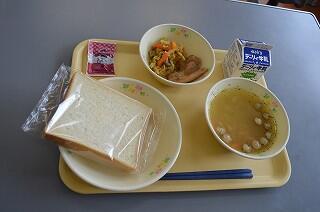 今日の献立は、食パン、チョコクリーム、照り焼きチキン、千切り大根のカレー炒め、コンソメスープ、牛乳です。