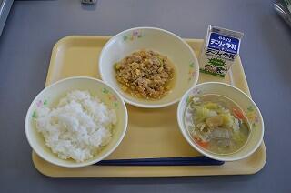 今日の献立は、鶏そぼろ丼、さつま汁、牛乳です。鶏そぼろ丼は、鶏肉と卵、青豆で丁度よい味加減で、ご飯といっしょに食べると美味しかったです。さつま汁は、サツマイモが入っていて、甘くて柔らかくやさしい味でした。サツマイモの甘さが引き立っていました。今日も美味しくいただきました。