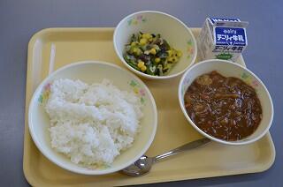 今日の献立は、ハヤシライス、海藻サラダ、牛乳です。ハヤシライスは牛肉のうま味と、マッシュルームの食感、なめらかなルーでご飯にかけて食べると、とろけるような美味しさでした。海藻サラダは、いろいろな海藻が入っていて食感の違いも味わえました。今日も美味しくいただきました。