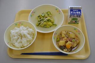 今日の献立は、麦ご飯、ジャガイモのそぼろ煮、梅肉の和え物、牛乳です。