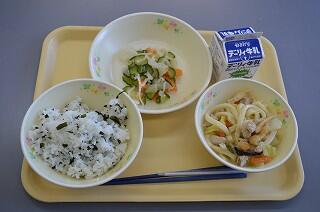 今日の献立は、わかめごはん、味噌煮込みうどん、ゆず酢和え、牛乳です。わかめご飯は、わかめの量も丁度よく,ほどよい味加減でした。味噌煮込みうどんは、ほんのり味噌味でうどん固さも丁度よく食べごたえもありました。ゆず酢和えはさっぱりとして美味しかったです。今日も美味しくいただきました。