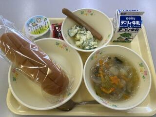 7/7(木)のメニューは『ウインナー』『野菜』『ホットドックパン』『天の川スープ』『七夕ゼリー』『ケチャップソース』『牛乳』でした。