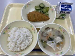 7/19(火)のメニューは『スープぎょうざ』『鮭のチーズフライ』『かっぱ漬け』『麦ごはん』『牛乳』でした。