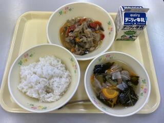8/26(金)のメニューは『つみれ汁』『豚肉となすのみそ炒め』『麦ごはん』『牛乳』でした。