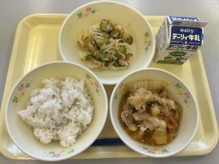 10/25(火)のメニューは『じゃが豚キムチ』『バンバンジー』『麦ごはん』『牛乳』でした。