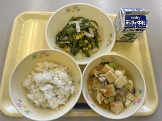 10/26(木)のメニューは『厚揚げの中華煮』『アスパラサラダ』『麦ごはん』『牛乳』でした。