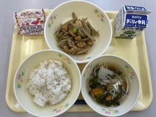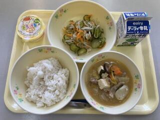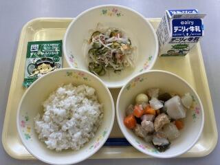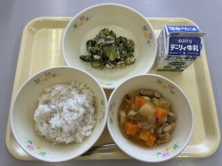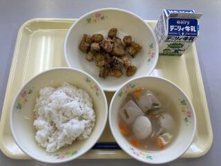 11/29(火)のメニューは『米粉のだご汁』『魚のカレー揚げ』『麦ごはん』『牛乳』でした。