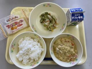 11/22(火)のメニューは『親子丼の具』『ピーマンドレッシング和え』『白ごはん』『みかんクレープ』『牛乳』でした。