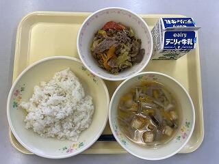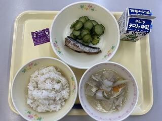 4/21(金)のメニューは『豚汁』『いわしのおかか煮』『かっぱづけ』『麦ごはん』『ゆかりふりかけ』『牛乳』でした。