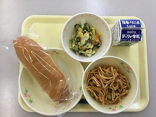 4/13(木)のメニューは『コールスローサラダ』『コッペパン』『スパゲティミートソース』『牛乳』でした。