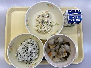 4/14(金)のメニューは『煮しめ』『千切り大根のマヨネース和え』『わかめごはん』『牛乳』でした。