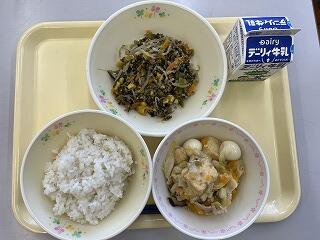 4/17(月)のメニューは『厚揚げの中華煮』『高菜の油いため』『麦ごはん』『牛乳』でした。