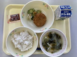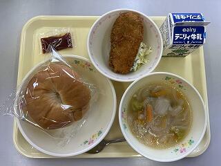 4/27(木)のメニューは『サーモンチーズフライ』「添え野菜』『バーガーパン』『オニオンスープ』『1食ケチャップ』『牛乳』でした。