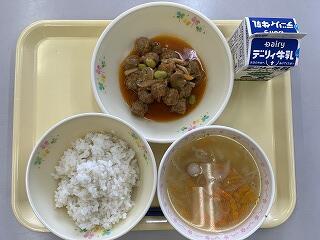 煮しめは味がよく染み込み、ごぼうも食べやすくておいしかったです。わかめごはんのほんのり塩味がより食欲をそそりました。千切り大根のマヨネース和えも、低学年の教室を回った時に児童が「まだ(おかわりが)食べたい!」と言ってくれる程おいしかったです。(今日は新しいALTのジョン先生が来て一緒に給食を食べました。和食メニューに「おいしい!」と喜んでくださっていました♪)