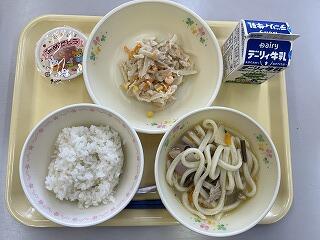 4/26(水)のメニューは『麦ごはん』『ごぼうサラダ』『山菜うどん』『牛乳』でした。